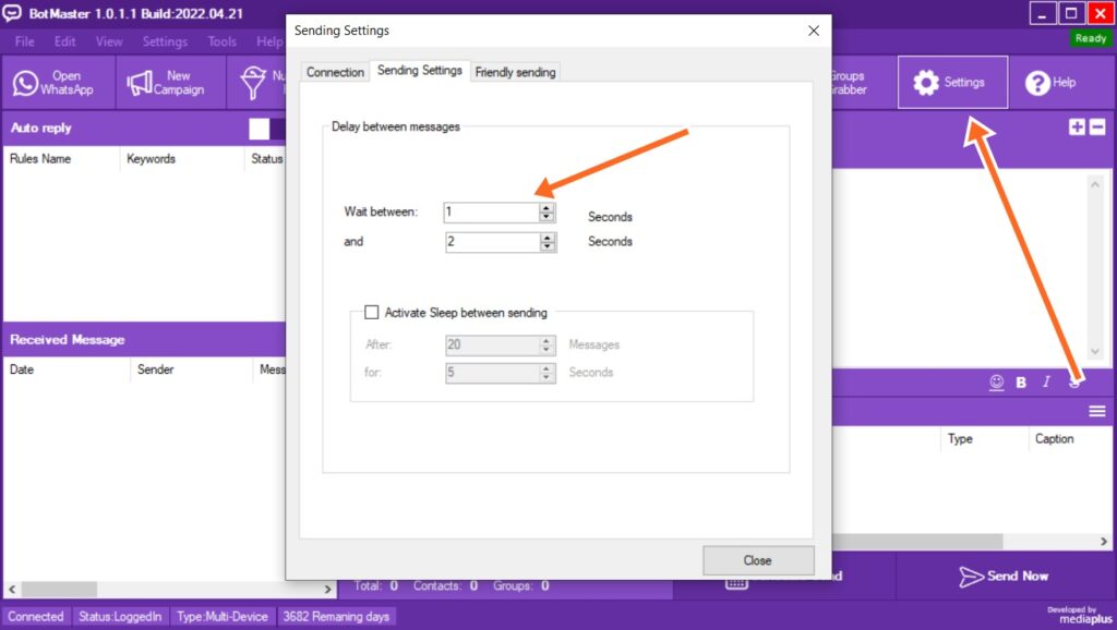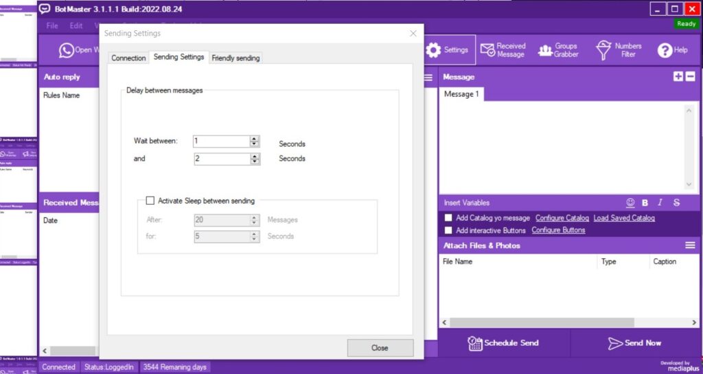 Dilengkapi dengan modul anti banned untuk kemanan nomor WA Anda seperti sleep control, connection speed, delay time, internal dialogs dan lain sebagainya.